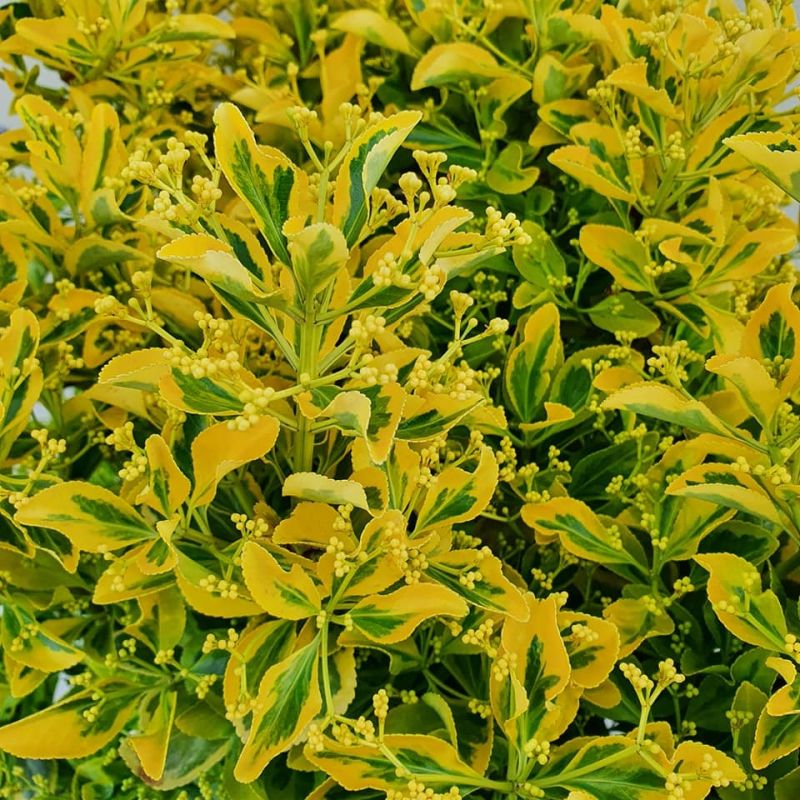 Les feuilles ovales affichent des marges jaunes dorées contrastant avec un centre d’un vert intense. Cette panachure unique confère à la plante un style moderne, évoquant la bonne humeur dès les premiers rayons du soleil. Grâce à cette combinaison de couleurs, cet arbuste persistant apporte une note sophistiquée qui valorise n’importe quel coin du jardin, quelle que soit la saison.