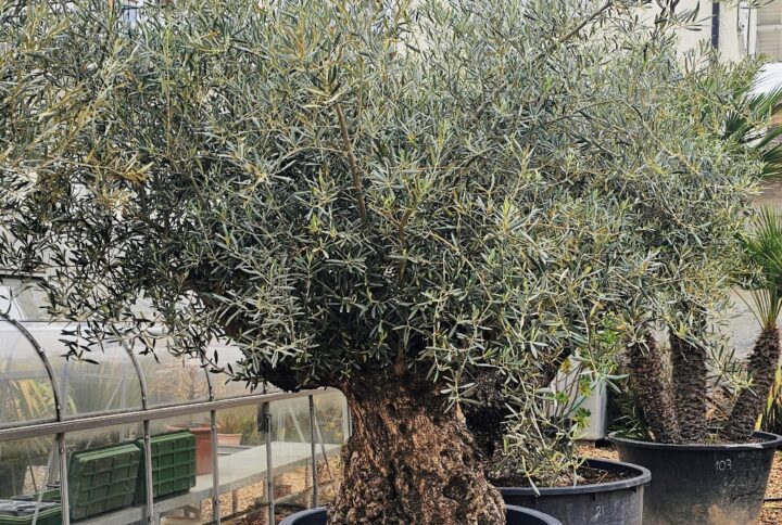 Arbre fruitier à feuillage persistant, l’olivier mesure généralement entre 4 et 10 mètres de hauteur, bien que certains spécimens puissent atteindre jusqu’à 15 mètres. Son tronc, noueux et souvent tordu avec l’âge, se couvre d’une écorce grisée qui s’exfolie en plaques irrégulières. Ses feuilles sont lancéolées, entières et coriaces, vert foncé sur le dessus et couvertes d’une fine pellicule argentée au revers.