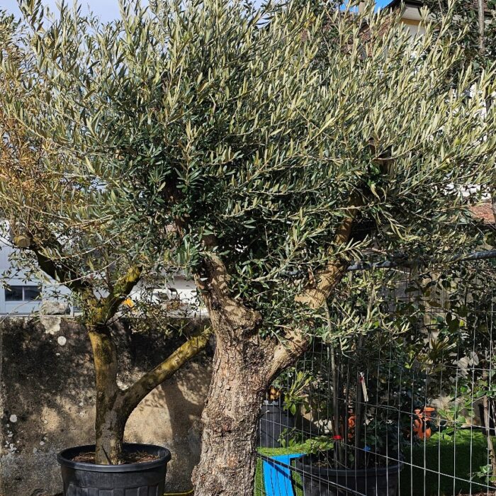 Arbre fruitier à feuillage persistant, l’olivier mesure généralement entre 4 et 10 mètres de hauteur, bien que certains spécimens puissent atteindre jusqu’à 15 mètres. Son tronc, noueux et souvent tordu avec l’âge, se couvre d’une écorce grisée qui s’exfolie en plaques irrégulières. Ses feuilles sont lancéolées, entières et coriaces, vert foncé sur le dessus et couvertes d’une fine pellicule argentée au revers.